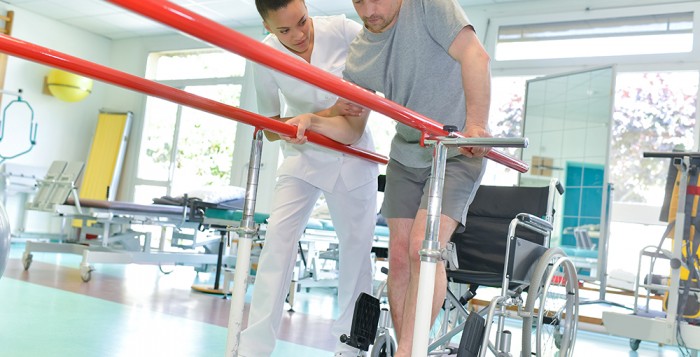 physiotherapist helping patient to walk